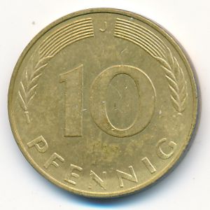 KM#108 ФРГ, 10 пфеннигов (1991 г.) Сталь, плакированная латунью, 21.5 мм, 4 г Категории: Без тематики. Смотрите подробное описание типа в каталоге.