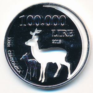 Кампионе-д’Италия., 100000 лир (2018 г.) Латунь, покрытая серебром, 38 мм, 20.9 г Категории: Unusual, Животные, Необычная форма, Юбилейные. Unusual. Олени. Италия. Смотрите подробное описание типа в каталоге.